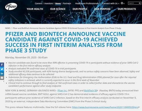 据辉瑞公司透露,该疫苗在临床试验中显示出高达95%的有效率,这意味着疫苗在预防新冠病毒感染方面具有显著效果。这一消息一经发布,立刻引起了全球范围内的广泛关注。